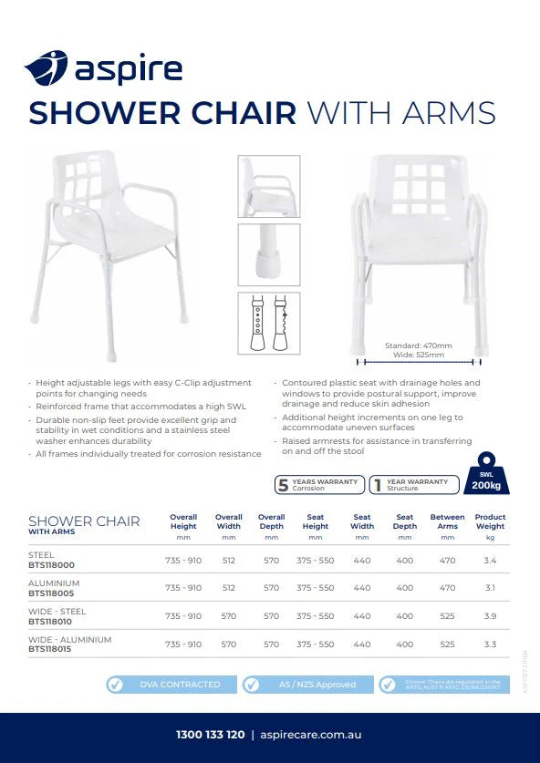 ASPIRE Shower Chair - With Arms - Wide (2 Types)